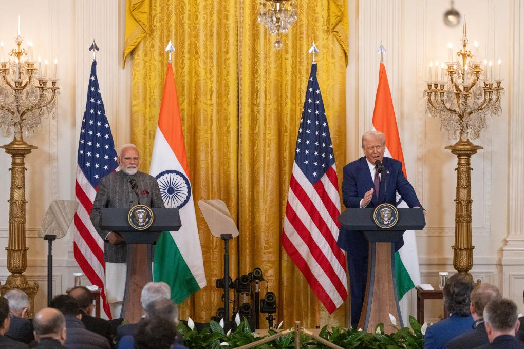 2月13日,美国总统特朗普(右)与到访的印度总理莫迪在华盛顿白宫出席联合记者会。新华社记者 胡友松 摄